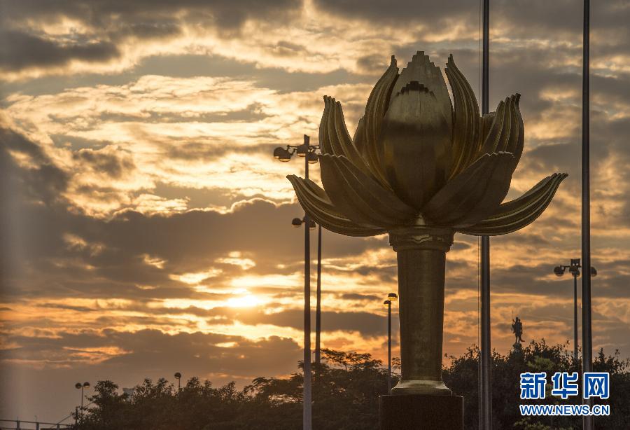 卯时。日出。12月20日清晨,矗立于澳门金莲花广场上的“盛世莲花”雕塑,在日出晨光映照下显得格外亮丽。