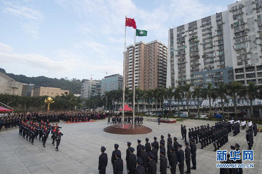 辰时。升旗。12月20日8时许,澳门特区政府在金莲花广场举行隆重升旗仪式,庆祝澳门回归祖国15周年。五星红旗和特区区旗冉冉升起。
