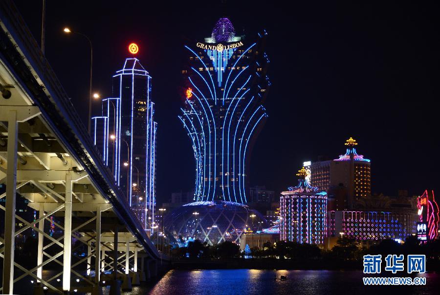 亥时。璀璨。12月18日22时许,澳门新葡京和葡京酒店灯光璀璨。