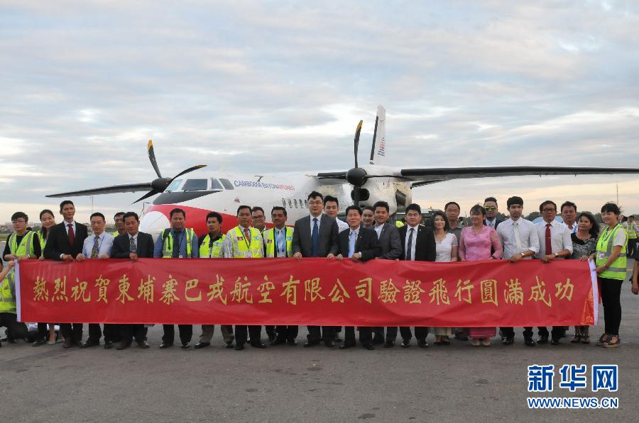 12月21日,在柬埔寨著名旅游城市暹粒,柬埔寨民航局官员与巴戎航空工作人员共同庆祝柬埔寨巴戎航空公司成功完成验证飞行。当日,柬埔寨巴戎航空公司圆满完成验证飞行,这标志着巴戎航空的运营许可证申请工作正式完成,公司将很快进入正式商业运营。执行此次验证飞行任务的中国产新舟60飞机进行了从柬埔寨首都金边到暹粒的往返飞行,柬埔寨民航局官员、巴戎航空控股公司领导、巴戎航空公司领导、中资企业代表等近50人共同体验了此次飞行。新华社记者李弘摄