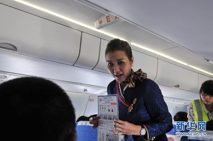 12月21日,在柬埔寨首都金边,巴戎航空所属的新舟60飞机执行验证飞行前,一名空姐为旅客讲解安全事项。当日,柬埔寨巴戎航空公司圆满完成验证飞行,这标志着巴戎航空的运营许可证申请工作正式完成,公司将很快进入正式商业运营。执行此次验证飞行任务的中国产新舟60飞机进行了从柬埔寨首都金边到暹粒的往返飞行,柬埔寨民航局官员、巴戎航空控股公司领导、巴戎航空公司领导、中资企业代表等近50人共同体验了此次飞行。新华社记者李弘摄