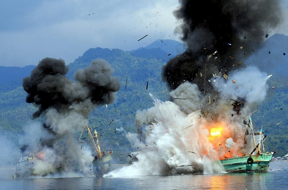 当地时间2014年12月21日,印尼安汶湾,印尼海军炸毁了两艘涉嫌进行非法捕鱼活动的外籍渔船,这辆艘渔船上挂着巴布亚新几内亚的国旗。来源:国际在线