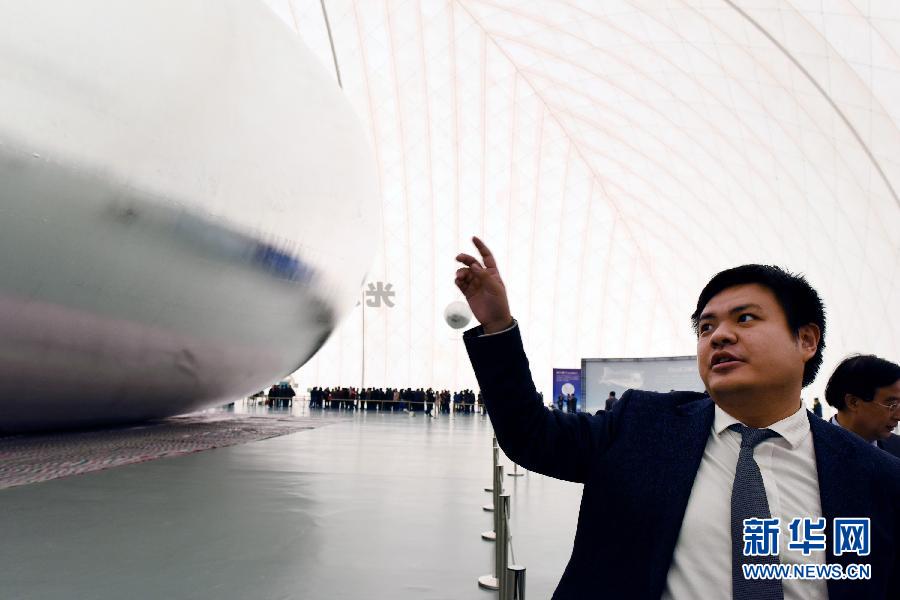 12月22日,光启科学董事局主席刘若鹏在阿波罗基地内介绍“云端”号。当日,光启科学位于深圳的阿波罗基地正式启用,光启1号空间库和颠覆式空间技术平台“云端”号亮相,展示光启科学空间技术的进展。光启科学宣布,该公司研发的颠覆式空间技术平台“云端”号和“旅行者”号将分别在北半球和南半球升空,两者提供的服务包括通讯覆盖、大数据收集推送和近太空旅游等。新华社记者毛思倩摄
