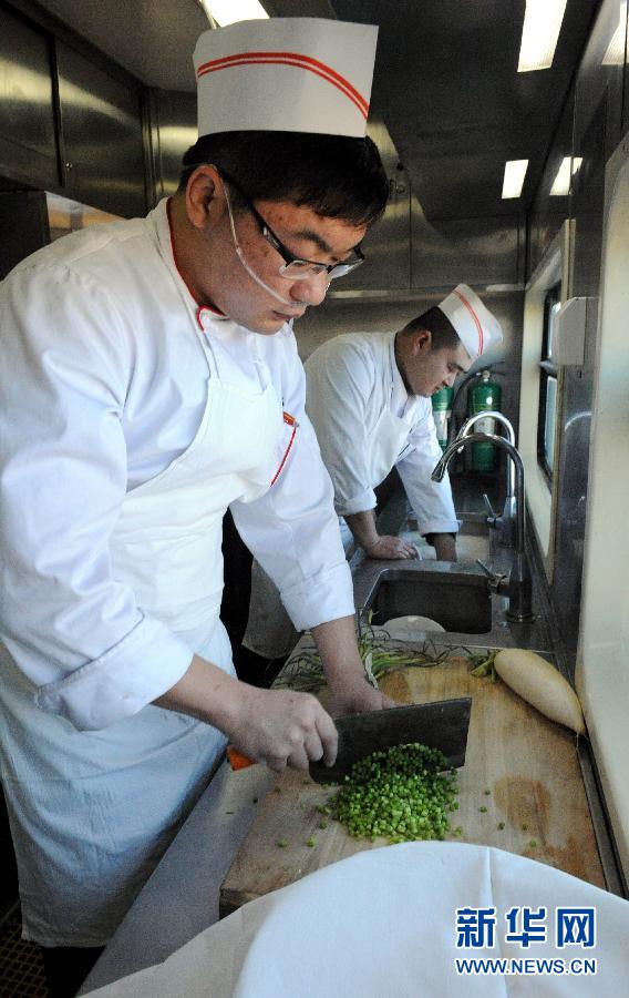 在北京至拉萨的Z21次列车通过唐古拉山区段时,京藏车队第十四组厨师长邱海灵(左)边吸氧边切菜(12月21日摄)。