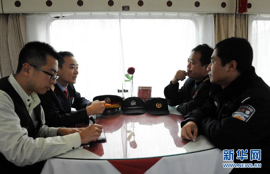 在北京至拉萨的Z21次列车上,京藏车队第十四组列车长、乘警、检车长组成的“三乘一体”小组商讨解决列车运行中的问题(12月20日摄)。