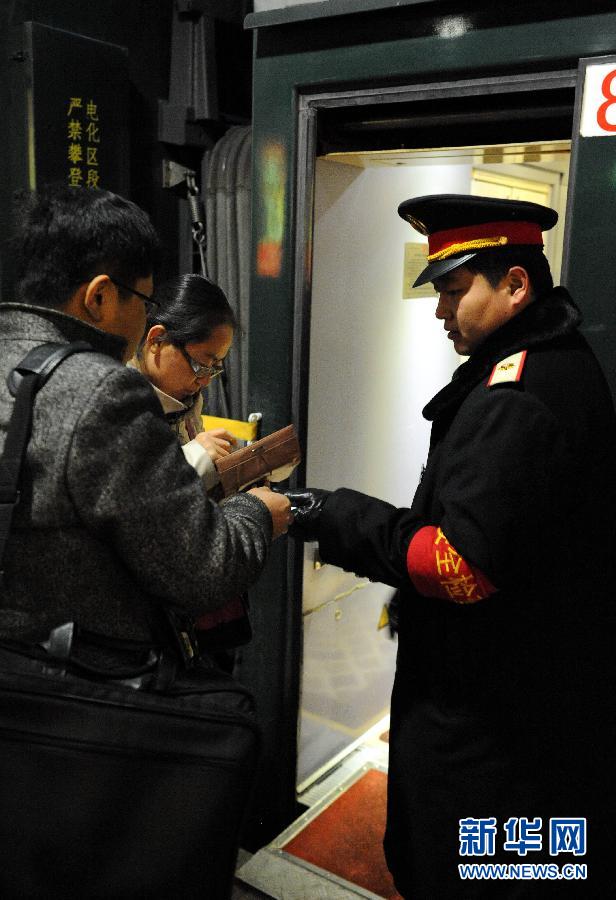 在北京至拉萨的Z21次列车到达石家庄站后,京藏车队第十四组列车员刘建楠迎候旅客上车(12月20日摄)。