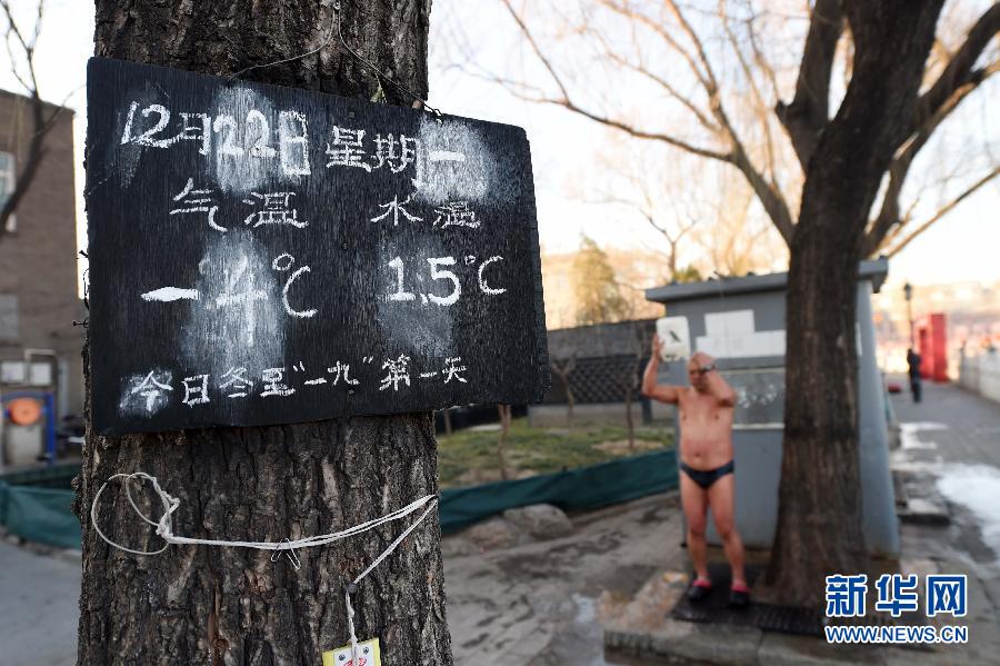 12月22日,一名冬泳爱好者在写有日期、水温等信息的小黑板旁冲洗身体。当日是二十四节气中的“冬至”,许多冬泳爱好者来到北京什刹海游泳健身。他们中的许多人常年坚持游泳,在享受游泳带来的快乐的同时,强健体魄,磨练意志。新华社记者陈晔华摄