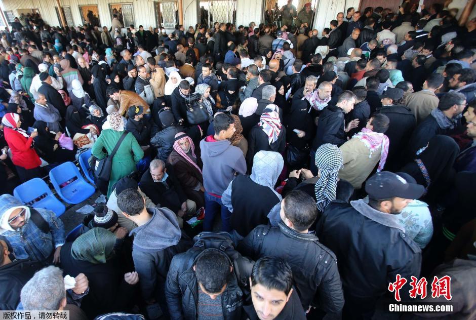 当地时间2014年12月22日,巴勒斯坦人在埃及与加沙边境的拉法过境处,等待进入埃及境内。