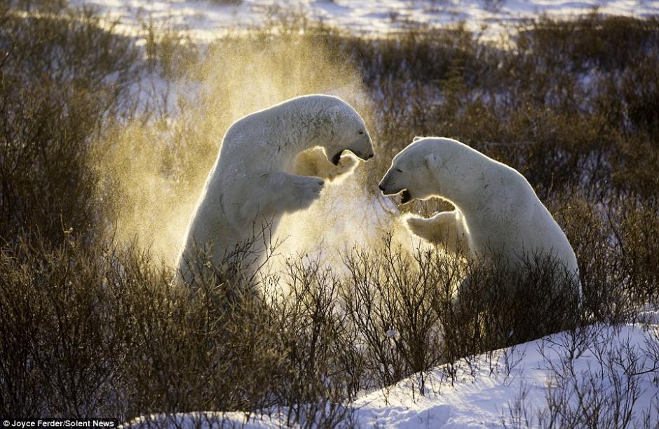 据英国《每日邮报》12月20日报道,两头九英尺高的北极熊在雪地中练习“摔跤”,但是不要担心,它们只是在玩闹。这两头北极熊在帮助彼此练习以后面对来自任何敌人威胁的能力,它们挥动着爪子,拍打推搡着彼此,甚至将彼此的头压到雪地中。这样的玩闹打斗大约持续了一个小时。(网页截图)
