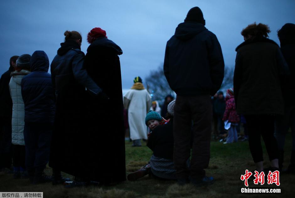 当地时间2014年12月22日,英国威尔特郡,民众在巨石阵迎接冬至日的到来。