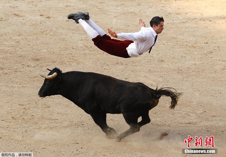 当地时间12月22日,哥伦比亚卡利,一位西班牙斗牛士在一场斗牛比赛上表演高难度动作,围绕公牛上下翻腾,滞空动作好似超人飞行。
