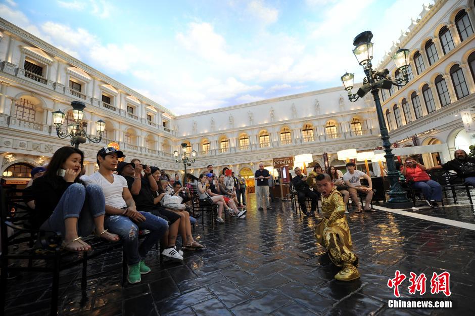 纯中国题材,并由中国艺术家打造的舞台秀“PANDA!”即将在拉斯维加斯宫殿剧院度过一年的演出期,来自河南郑州的少林武术9岁小演员赵郑辉,伴随着“PANDA!”成熟的步伐一步步长大。图为“小豆子”在拉斯维加斯威尼斯人酒店为游客做宣传表演。 中新社发 毛建军 摄