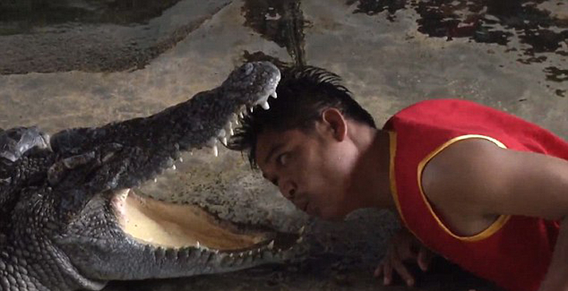 据英国《每日邮报》当地时间12月21日报道,在泰国曼谷的沙慕普兰大象乐园,有一项表演令所有的游客胆战心惊,动物园表演的艺人居然将自己的头伸入巨鳄张开的血盆大口中,稍有不慎,就有生命危险。更让人称奇的是,还有的表演者觉得这样不过瘾,竟把手伸进了鳄鱼的喉咙,看傻众人。(网页截图)