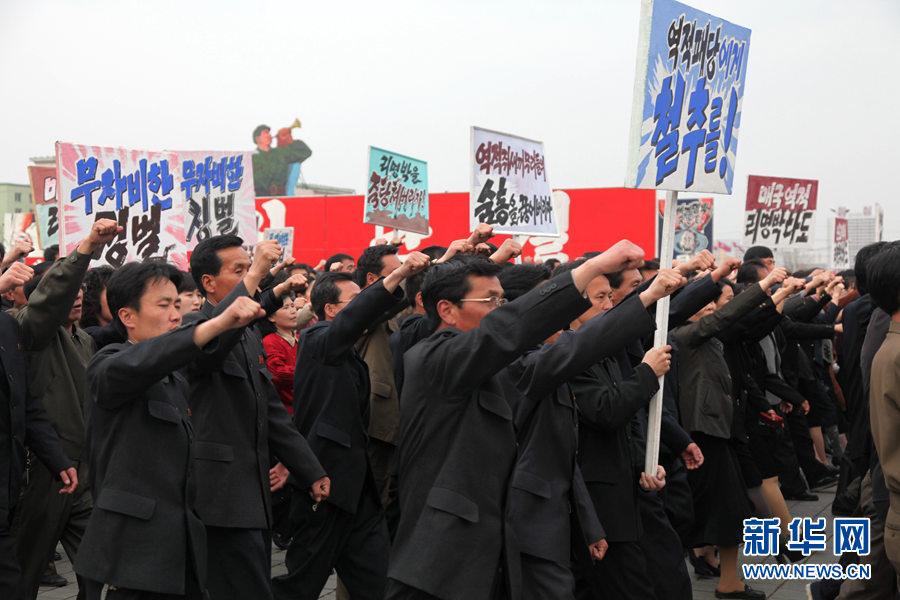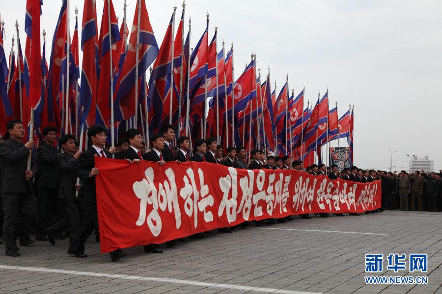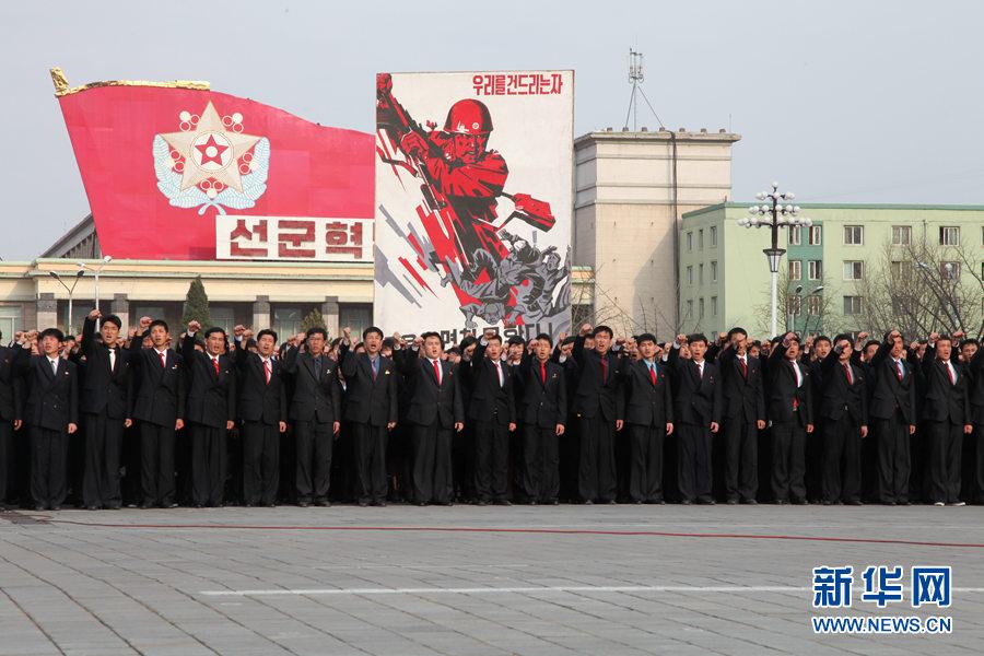 2012年4月20日朝鲜平壤举行的10万人集会,声讨韩国总统李明博。指责他再次冒犯朝鲜最高领导层尊严,并要求韩国道歉,否则将面临“神圣的战争”。图为声讨李明博十万人集会现场,集会者的口号响亮。