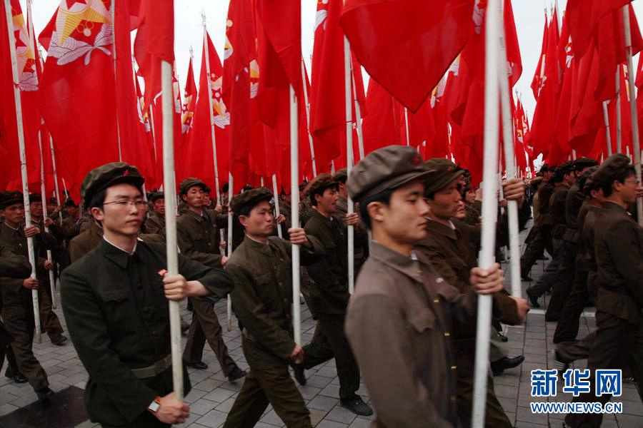2012年4月20日朝鲜平壤举行的十万人集会,声讨韩国总统李明博。指责他再次冒犯朝鲜最高领导层尊严,并要求韩国道歉,否则将面临“神圣的战争”。图为声讨李明博十万人集会现场,集会者动作整齐划一。
