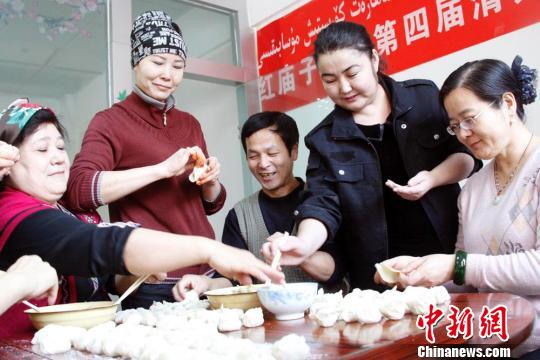 12月22日,乌鲁木齐市红庙子街道金山江路西社区喜迎冬至社区干部职工、居民一起包饺子过节。王小军 摄