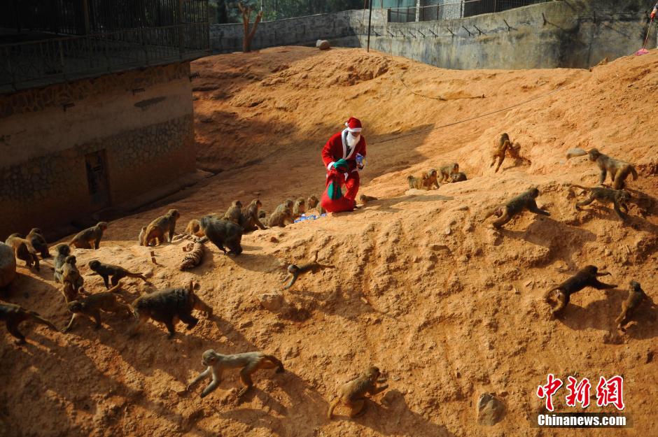 12月22日,在圣诞节即将来临之际,云南野生动物园的工作人员打扮成圣诞老人的模样,为动物园里的猴群送上节日礼物。中新社发 刘冉阳 摄