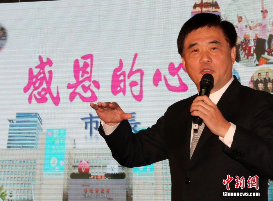 12月22日,台北市长郝龙斌在市府大楼出席卸任感恩茶会。3天后,在台湾“九合一”选举中胜出的柯文哲将正式接任台北市长。中新社发 刘舒凌 摄