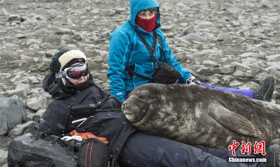 当地时间2014年12月20日报道,近日,南极洲利文斯顿岛,一名女游客Lea McQuillan坐下来,想休息一下,想不到却被一头海象宝宝当了肉垫,野生动物摄影师Roy Mangersnes拍摄到了这滑稽的一幕,只见小海象先是闻了闻Lea的手,随后立刻认定这是一个好肉垫,很快就整个身体爬到了Lea身上,开始呼呼大睡,一睡就是好几个小时。