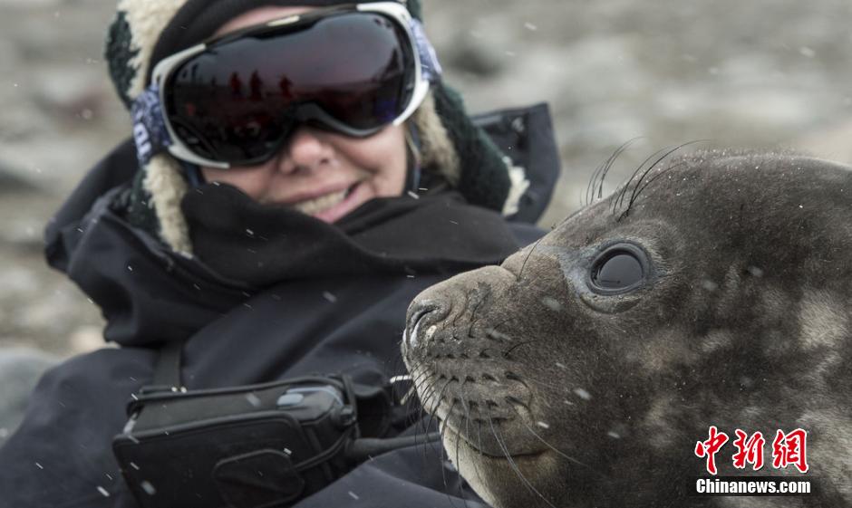 当地时间2014年12月20日报道,近日,南极洲利文斯顿岛,一名女游客Lea McQuillan坐下来,想休息一下,想不到却被一头海象宝宝当了肉垫,野生动物摄影师Roy Mangersnes拍摄到了这滑稽的一幕,只见小海象先是闻了闻Lea的手,随后立刻认定这是一个好肉垫,很快就整个身体爬到了Lea身上,开始呼呼大睡,一睡就是好几个小时。