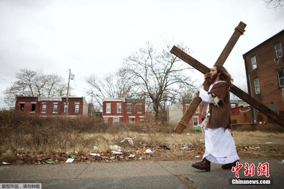 当地时间2014年12月20日,美国费城,圣诞节来临之际,被称“费城耶稣”的28岁青年Michael Grant身背12英尺长的十字架,从费城北部走了8公里到市中心,以传播圣诞节的真正含义。后来几人加入了他的旅程,还有路人向他喊道“赞美耶稣”,“谢谢您这么做”。Michael几乎每天装扮成耶稣已经近8个月了,他时常走在费城街头传播福音,因而得到了“费城耶稣”的称号。