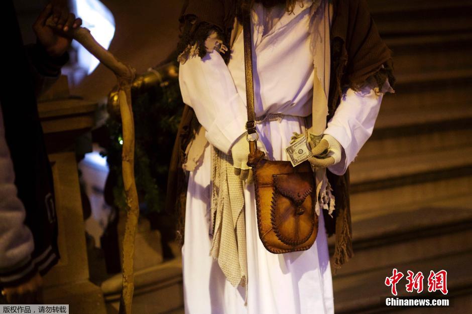 当地时间2014年12月20日,美国费城,圣诞节来临之际,被称“费城耶稣”的28岁青年Michael Grant身背12英尺长的十字架,从费城北部走了8公里到市中心,以传播圣诞节的真正含义。后来几人加入了他的旅程,还有路人向他喊道“赞美耶稣”,“谢谢您这么做”。Michael几乎每天装扮成耶稣已经近8个月了,他时常走在费城街头传播福音,因而得到了“费城耶稣”的称号。