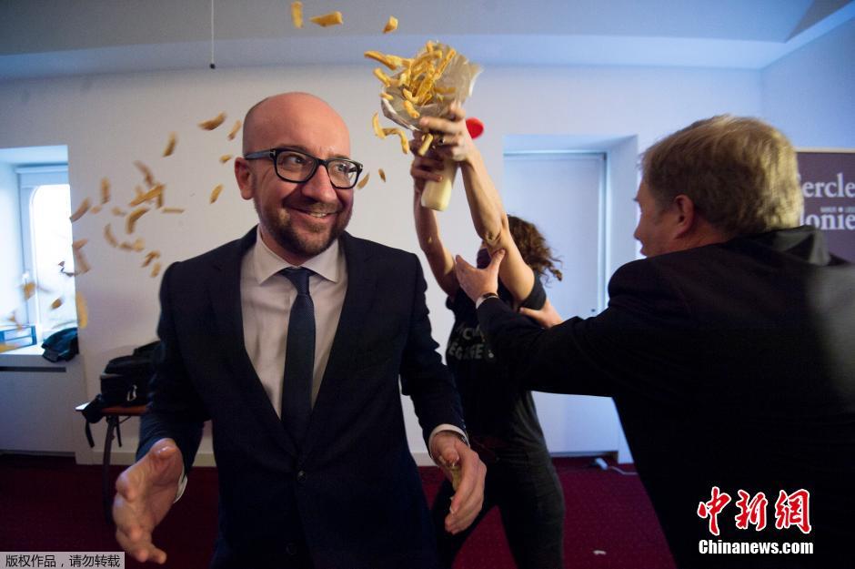 当地时间2014年12月22日,比利时那慕尔,比利时首相查理·米歇尔出席新闻发布会时,遭到女权活动组织LilithS成员袭击,示威者向其身上投掷薯条和蛋黄酱。LilithS组织是女权活动组织Femen在比利时的分支。