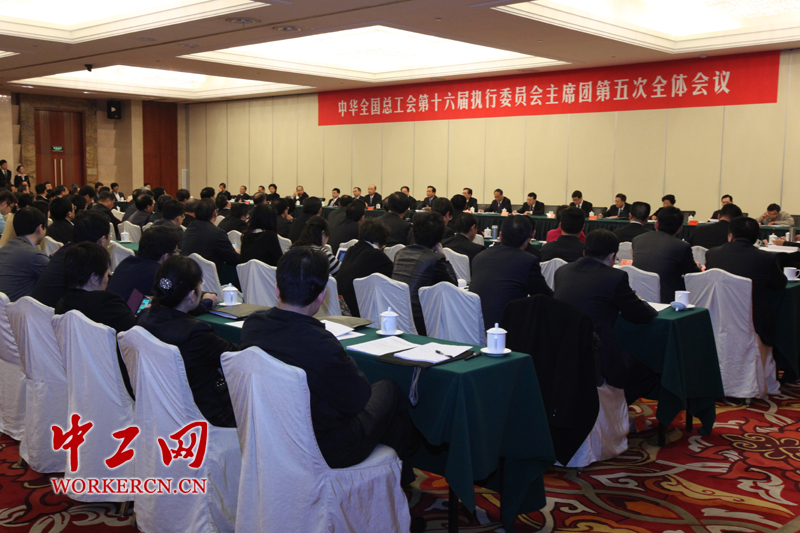 12月23日下午,中华全国总工会第十六届执行委员会主席团第五次全体会议在北京召开。中共中央政治局委员、中华全国总工会主席李建国主持会议。会议审议通过了全总十六届三次执委会议议程,审议并原则通过拟提交全总十六届三次执委会议审议的工作报告(审议稿)和《中华全国总工会关于贯彻落实党的十八届四中全会精神 大力推进工会工作法治化建设的实施意见(审议稿)》。会议还审议并原则通过了拟提交全总十六届三次执委会议和经审会第三次会议履行民主程序的有关人事事项。 中工网记者 李雪峰 摄