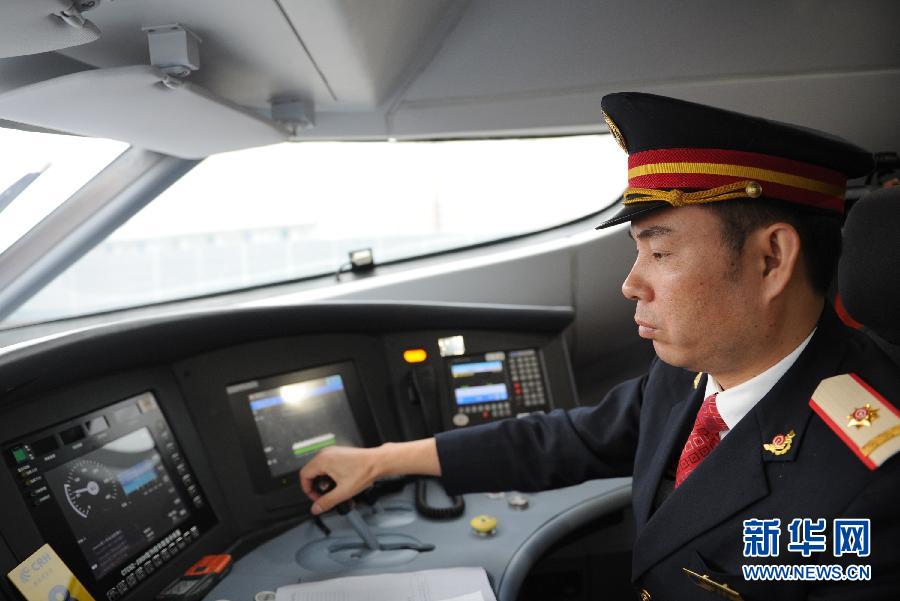 12月23日,贵广高铁动车司机在试运行途中操控动车。经过长时间的动车按运行图运行、模拟旅客乘降、车上应急演练等联调联试程序,贵广高铁试运行情况总体平稳,各方面准备工作目前已基本就绪。根据成都铁路局此前发布的消息,贵广高铁将于12月26日正式开通运行。贵广高铁自贵阳北站起,终点广州南站,全长857公里,由和谐号CRH2A型新动车组运行,最高运行速度每小时250公里,从贵阳到广州全程时间约为4小时。新华社记者 刘续 摄