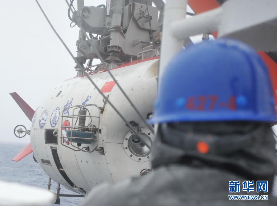 12月23日,科考队员在大雨中将“蛟龙”号载人潜水器回收至母船。当日,“蛟龙”号载人潜水器在西南印度洋下潜,这是中国载人潜水器首次到海底热液区下潜作业。海底热液区中的热液硫化物是目前日益受到国际关注的一种海底矿藏。新华社记者张旭东摄