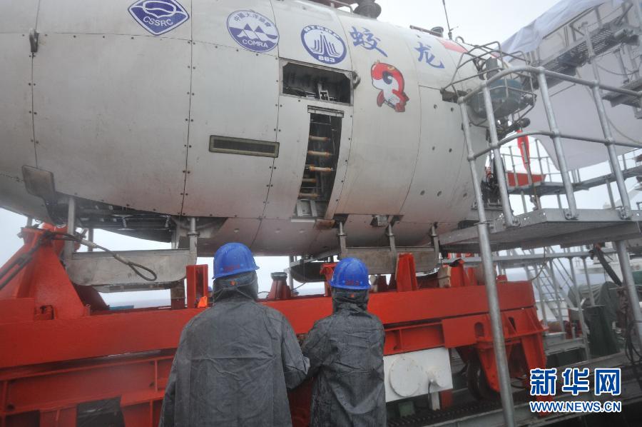 12月23日,科考队员在大雨中将“蛟龙”号载人潜水器回收至母船。当日,“蛟龙”号载人潜水器在西南印度洋下潜,这是中国载人潜水器首次到海底热液区下潜作业。海底热液区中的热液硫化物是目前日益受到国际关注的一种海底矿藏。新华社记者张旭东摄