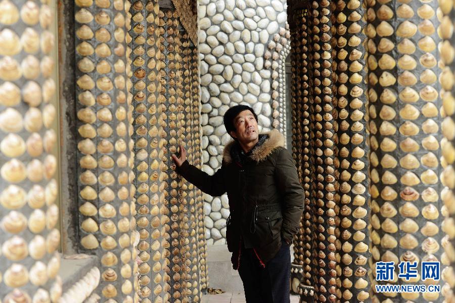 12月23日,肖永生在查看贝壳楼廊柱上的贝壳。