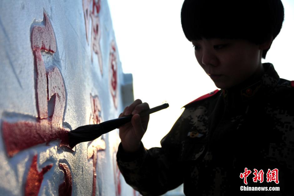 图为新疆公安边防总队训练基地女兵正在堆砌的“冰雪照壁”上写字。范昕羽 摄