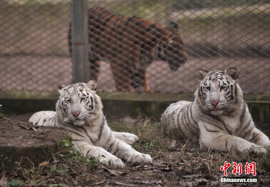 12月23日,重庆动物园首次引进的一对白虎,经过为期一个月的隔离检疫观察期之后,正式放归虎山与游客见面。图为两只白虎正在虎山嬉戏玩耍。 陈超 摄
