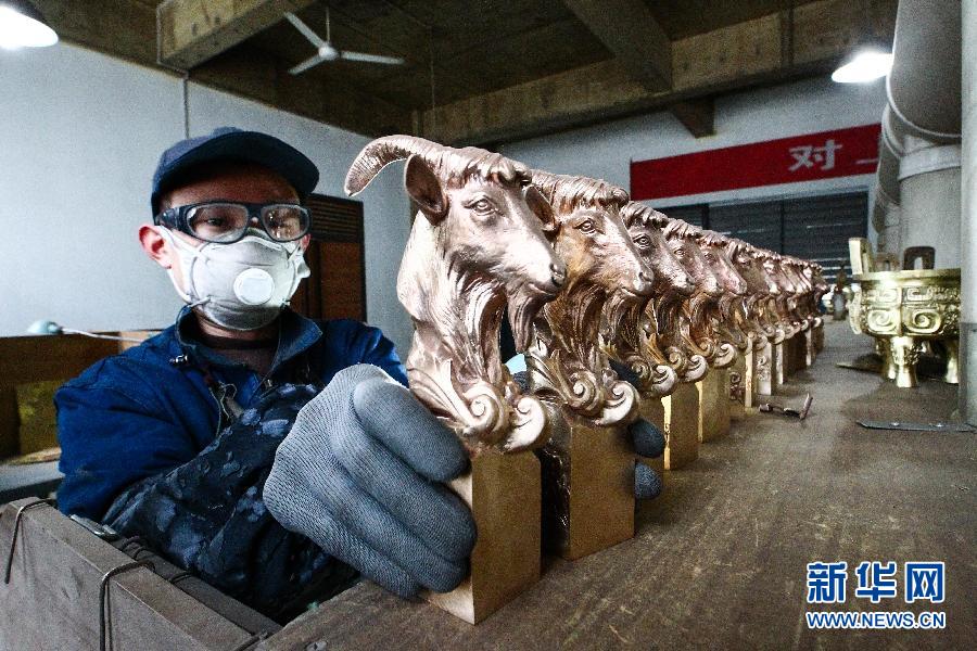 12月24日,在山东省潍坊市临朐县华艺雕塑公司,一名工作人员整理刚完成的铜羊工艺品。 随着羊年的临近,山东潍坊等地的工艺品生产企业加紧生产各类以“羊”为主题的工艺品,供应节日市场。 新华社发(孙树宝 摄)