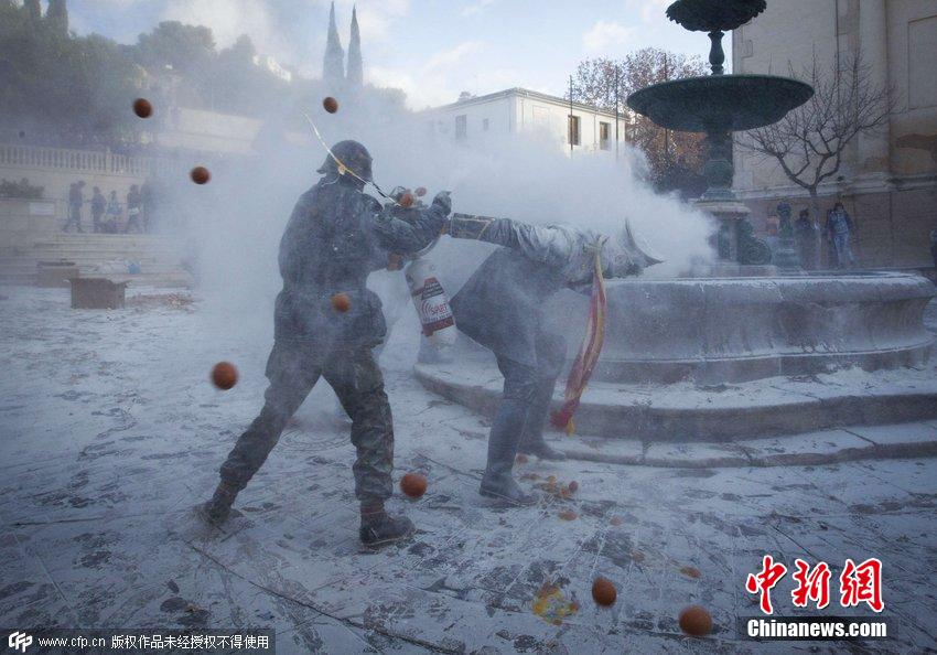 当地时间2014年12月28日,西班牙东南Ibi镇,民众穿着军人制服参加“面粉大战”。面粉节在此地已有200年的历史,是诸圣婴孩庆日庆祝活动的一部分。 图片来源:CFP视觉中国