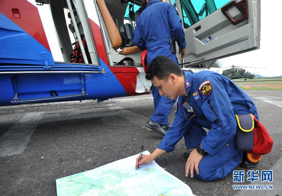 12月29日,在印度尼西亚邦加勿里洞附近,飞行员在起飞前标记航图。当日,印度尼西亚派出空警在勿里洞岛附近海域搜寻亚航QZ8501航班的下落。12月28日,亚航QZ8501航班在勿里洞岛附近海域失联。新华社发(维里 摄)