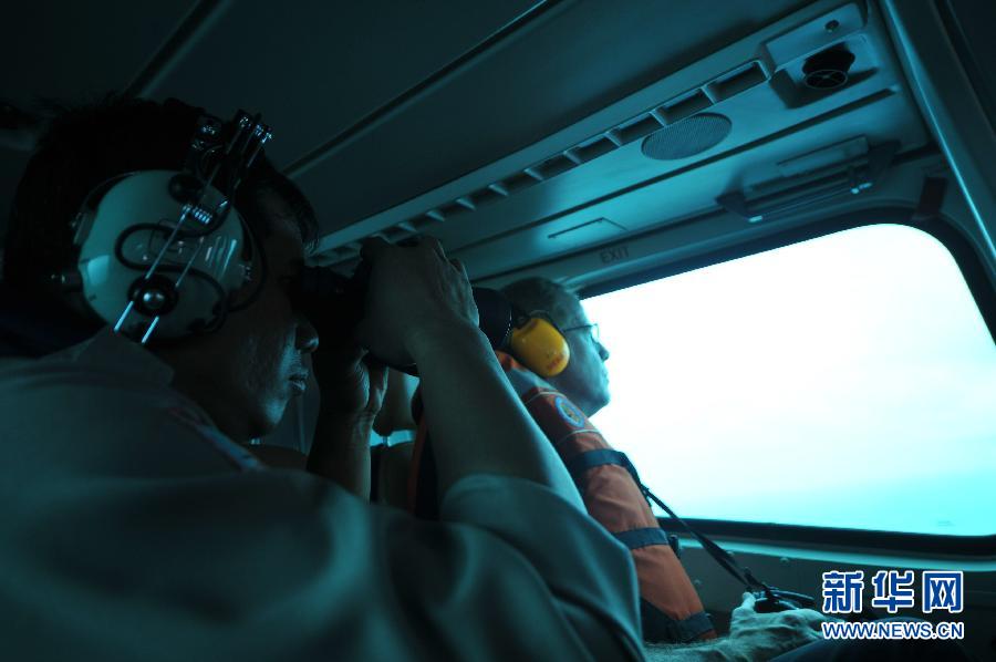 12月29日,搜救人员在直升机上巡查印度尼西亚勿里洞岛附近海域。当日,印度尼西亚派出空警在勿里洞岛附近海域搜寻亚航QZ8501航班的下落。12月28日,亚航QZ8501航班在勿里洞岛附近海域失联。新华社发(维里 摄)