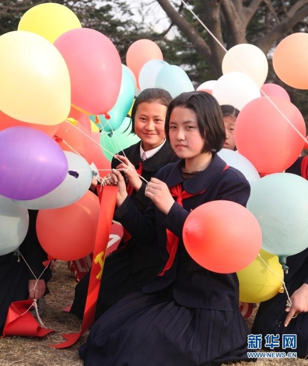 金正日逝世后,在万寿台金日成、金正日落成典礼上手持的女学生。图片来源:新华网