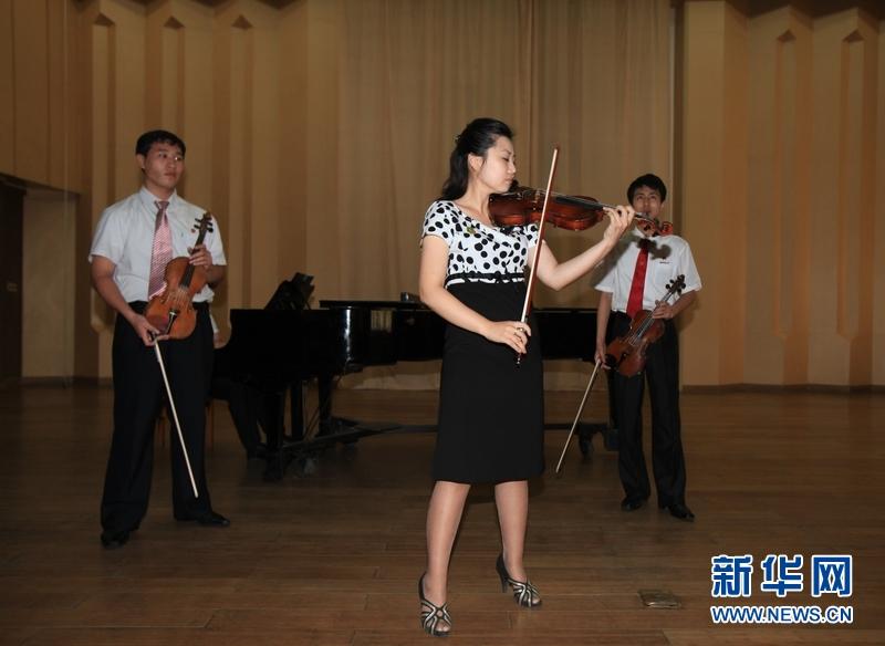 记者采访金元钧平壤音乐大学时学生在表演小提琴。图片来源:新华网