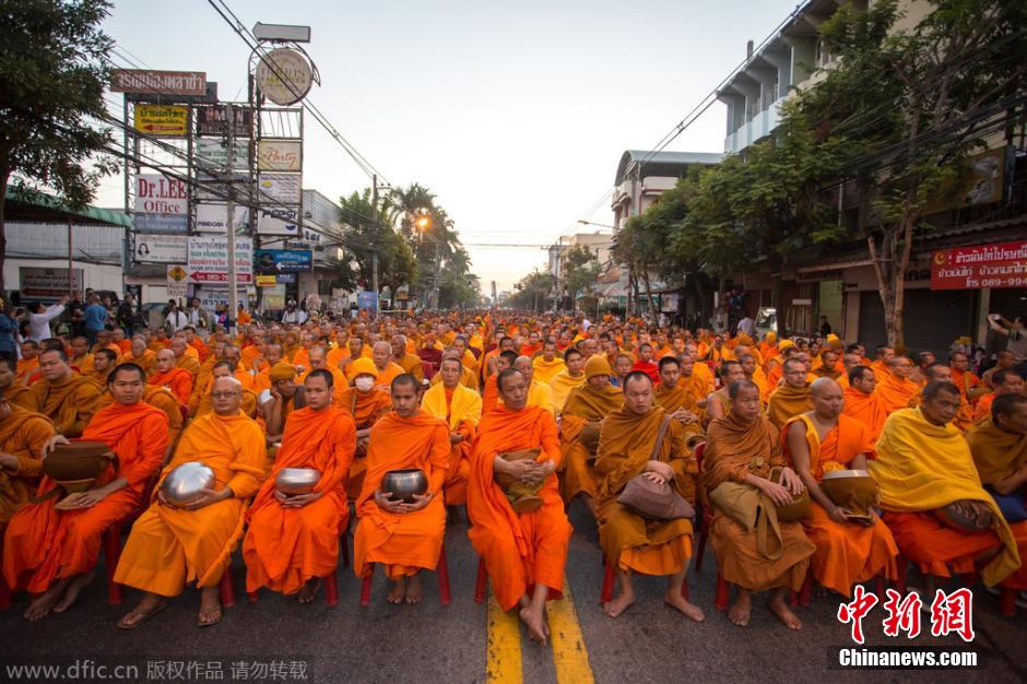 当地时间2014年12月28日,泰国清迈,民众给小僧侣们施舍。来自泰国全国的一万名僧侣参加了在当地举行的年度大规模化缘仪式。