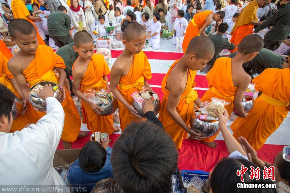 当地时间2014年12月28日,泰国清迈,民众给小僧侣们施舍。来自泰国全国的一万名僧侣参加了在当地举行的年度大规模化缘仪式。