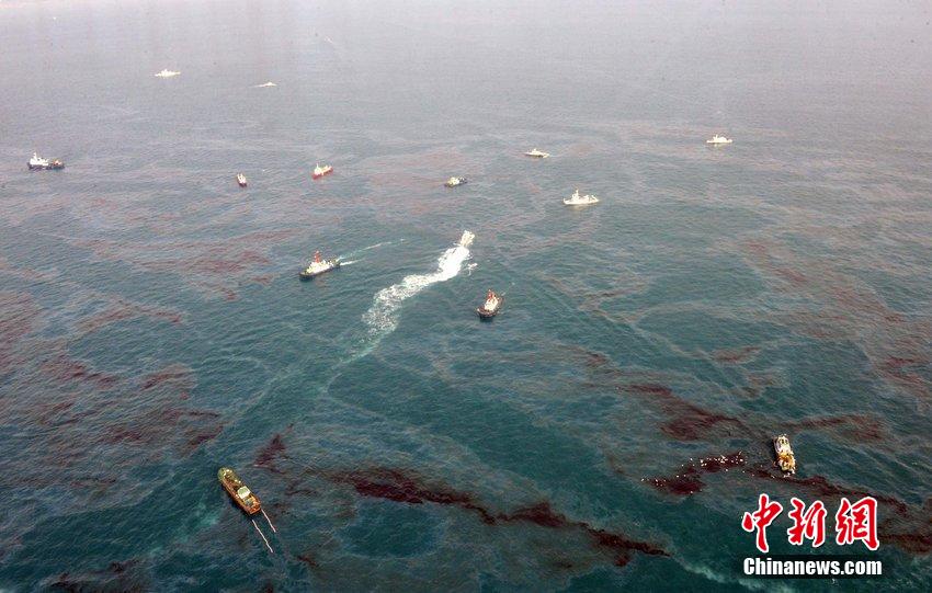 当地时间2014年12月28凌晨,韩国釜山,两艘船舶在韩国釜山市前海相撞,造成油污泄漏入海。釜山海洋环境公团工作人员对泄露油污进行清除。