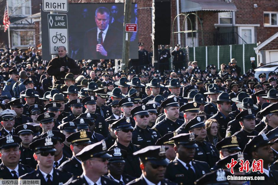 当地时间2014年12月27日,美国纽约,美国纽约市27日为遭枪杀警察拉斐尔.拉莫斯举行规模庞大的葬礼,副总统约瑟夫.拜登和数以万计警察参加。葬礼在拉莫斯所住皇后区一座教堂举行。除拜登,出席葬礼的高级官员还包括纽约州长安德鲁.科莫、市长白思豪和纽约市警务专员比尔布拉顿。纽约市长白思豪致辞时,遭遇大量警察“转身”抗议。