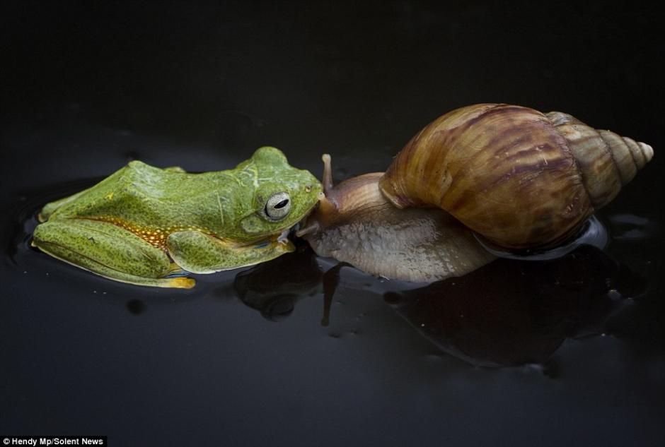 据《每日邮报》近日报道,印尼西加里曼丹三发地区,一只小青蛙和一只小蜗牛看起来就像是一对朋友似的,在青蛙爬上蜗牛的壳之前,它似乎还给了蜗牛一个吻。这一场景被摄影师Hendy Mp在自家附近拍摄到。(网页截图)