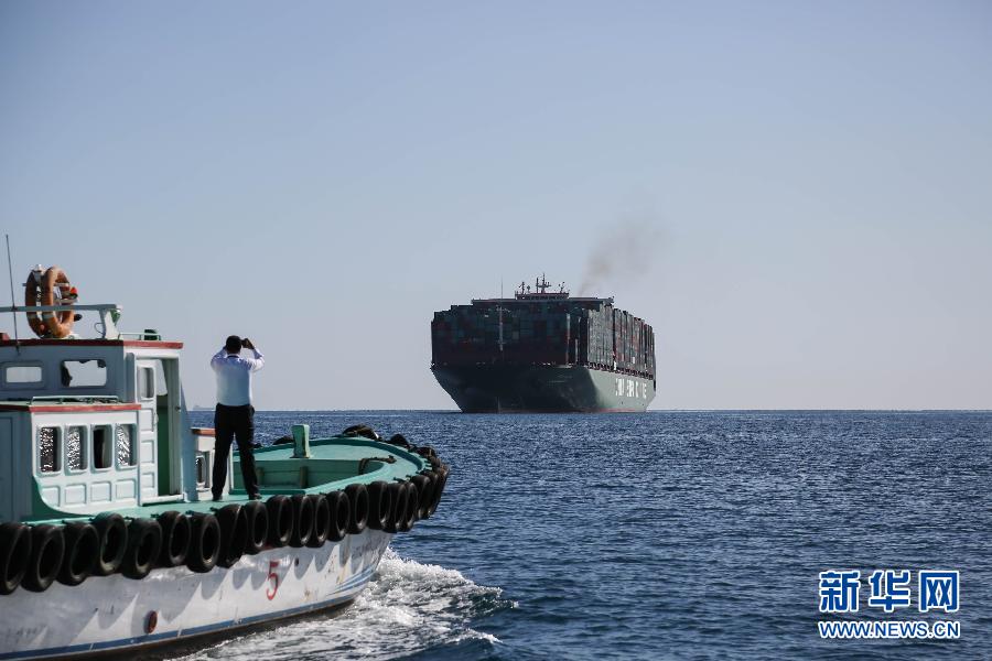 12月30日,在埃及苏伊士湾,中国海运集团埃及公司一名工作人员迎接“中海环球”轮。当日,世界最大的集装箱船“中海环球”轮首航抵达埃及苏伊士湾,并将继续前往欧洲四国。该轮船隶属中国海运集团旗下的中海集装箱股份有限公司(中海集运),全长400米、宽近60米,约10层楼高,船体超过4个标准足球场,可装载19100个标准集装箱。新华社记者卜多门摄