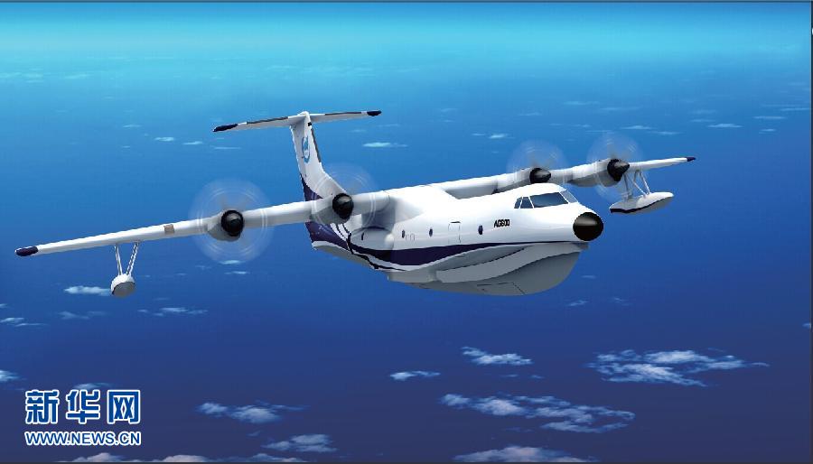 大型灭火/水上救援水陆两栖飞机AG600设计图(资料照片)。当日,大型灭火/水上救援水陆两栖飞机AG600首个大部件——中机身在中航飞机西安分公司顺利下架,标志着AG600飞机进入整体装配阶段,项目研制取得阶段性成果。 AG600飞机是国务院立项批复的三个大型民机飞机项目之一。主要用于森林灭火和水上救援。 新华社记者 李华 摄
