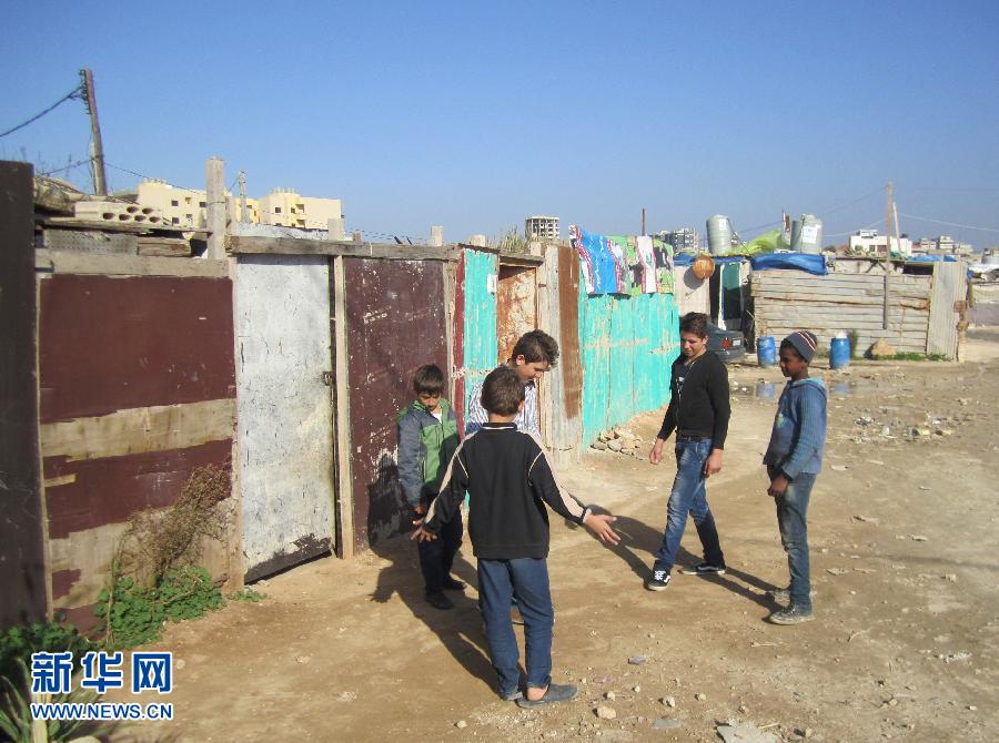 12月30日,在黎巴嫩北部城市的黎波里郊区的一处叙利亚难民营,叙利亚难民儿童在用废弃材料搭成的“家”门前玩耍。