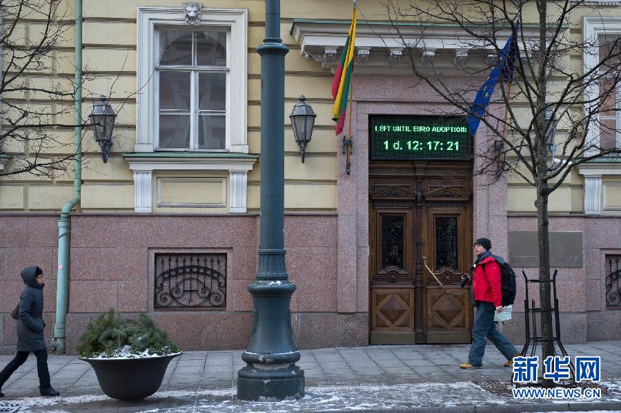 12月30日,在立陶宛维尔纽斯,立陶宛中央银行的门上方显示着加入欧元区的倒计时。 2015年1月1日,立陶宛将正式加入欧元区,成为其第19个成员国。波罗的海三国中的另外两个国家——爱沙尼亚和拉脱维亚已经分别于2011年和2014年加入欧元区。欧盟理事会设定欧元与立陶宛现行货币立特的兑换汇率为1比3.4528。新华社发(阿尔弗雷达斯·普里亚迪斯摄)
