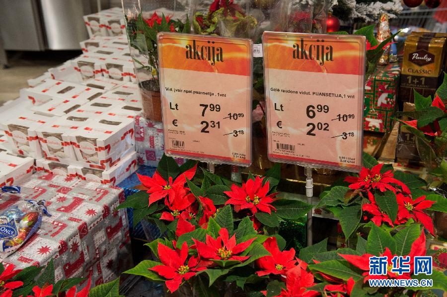 12月30日,在立陶宛维尔纽斯,超市商品的价格牌上显示立特和欧元两种价格。 2015年1月1日,立陶宛将正式加入欧元区,成为其第19个成员国。波罗的海三国中的另外两个国家——爱沙尼亚和拉脱维亚已经分别于2011年和2014年加入欧元区。欧盟理事会设定欧元与立陶宛现行货币立特的兑换汇率为1比3.4528。新华社发(阿尔弗雷达斯·普里亚迪斯摄)